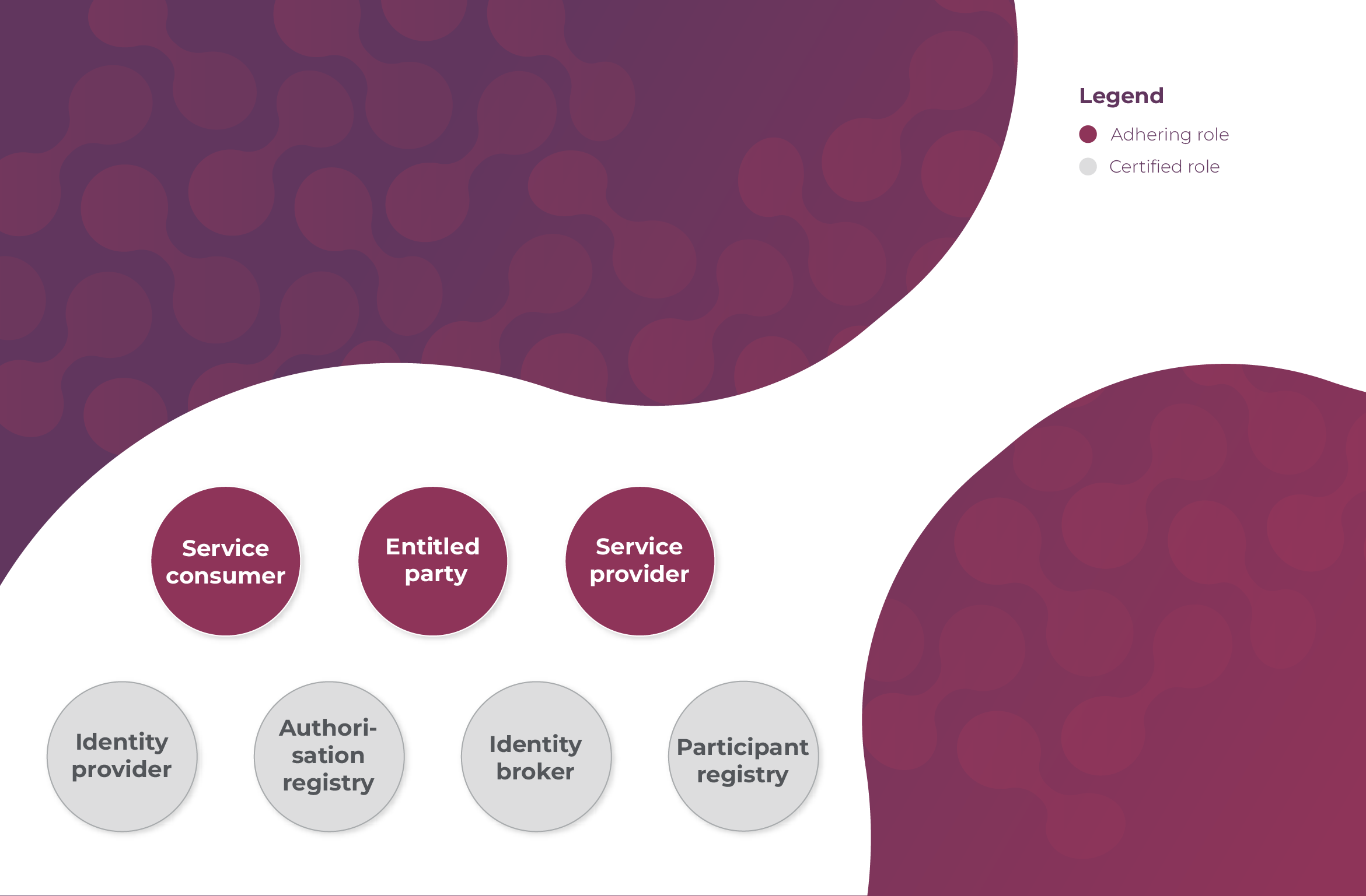 * Parties fulfilling **certified roles**, depicted in grey, facilitate functions that Adhering Parties can rely upon when providing or consuming services. To become certified, these parties must not only prove adherence to the iSHARE terms of use but also meet several role-specific criteria.