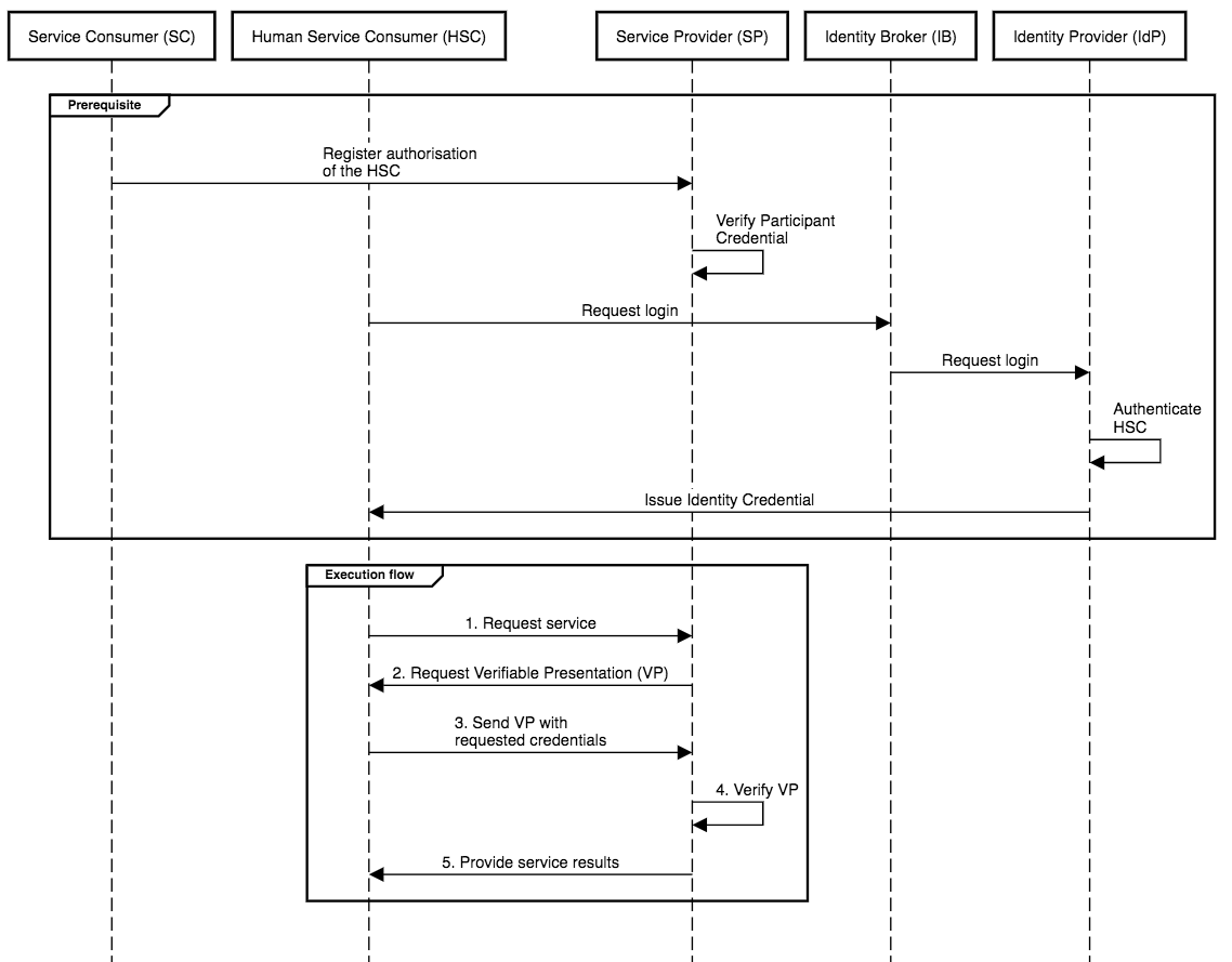 2. The Service Provider (Party B) requests a verifiable presentation (VP) from Human Service Consumer (HSC) with all the required verifiable credentials (Identity, Participant and DataRights);