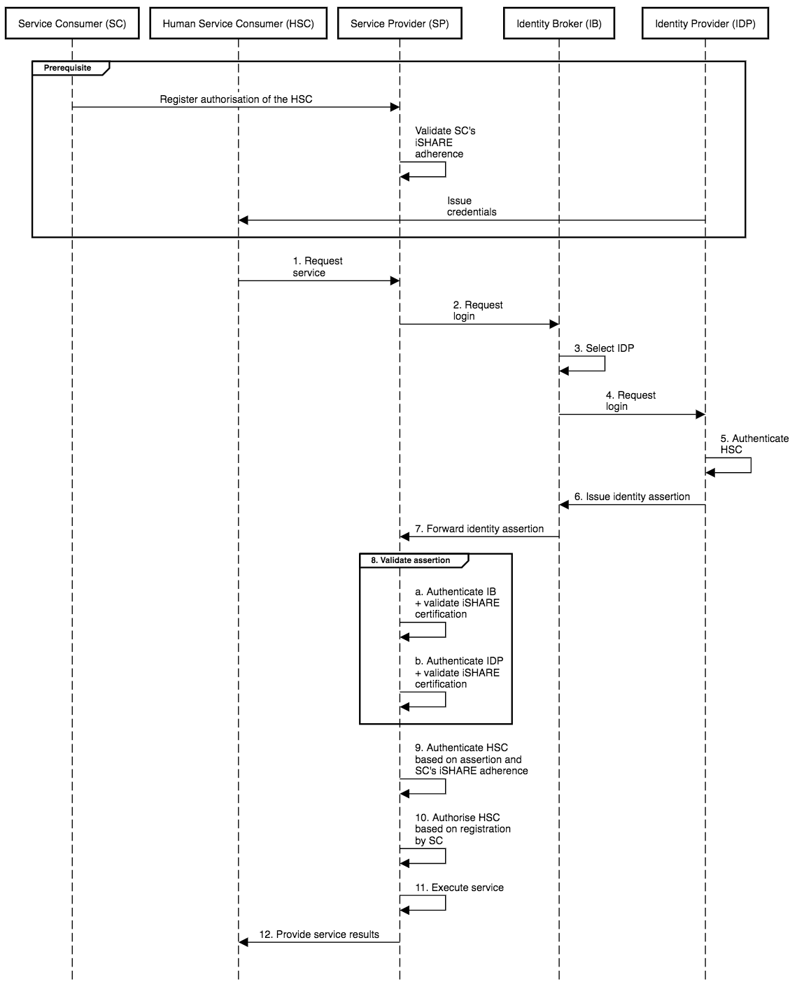 9. The Service Provider (Party B) authenticates the Human Service Consumer (Human X) based on the validity of the identity assertion, and validates the iSHARE adherence of the Service Consumer (Party A);