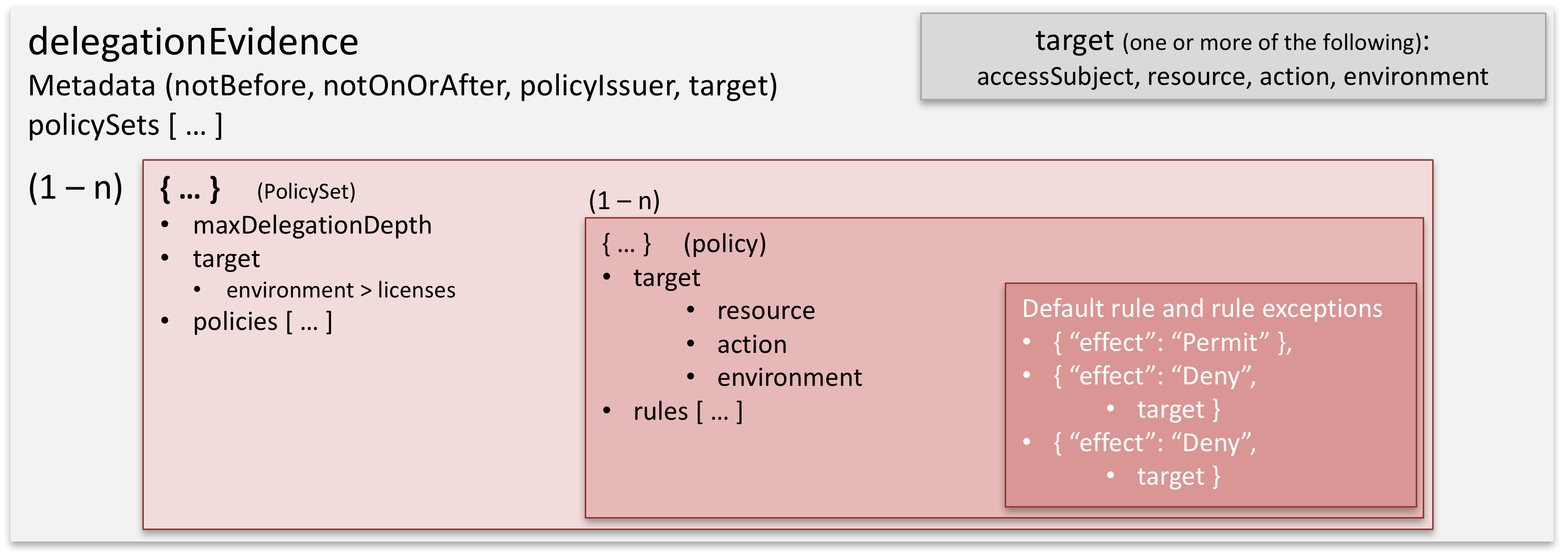 Delegation evidence is modelled as a JSON object inspired by the XACML 3.0 specifications and structured as follows: