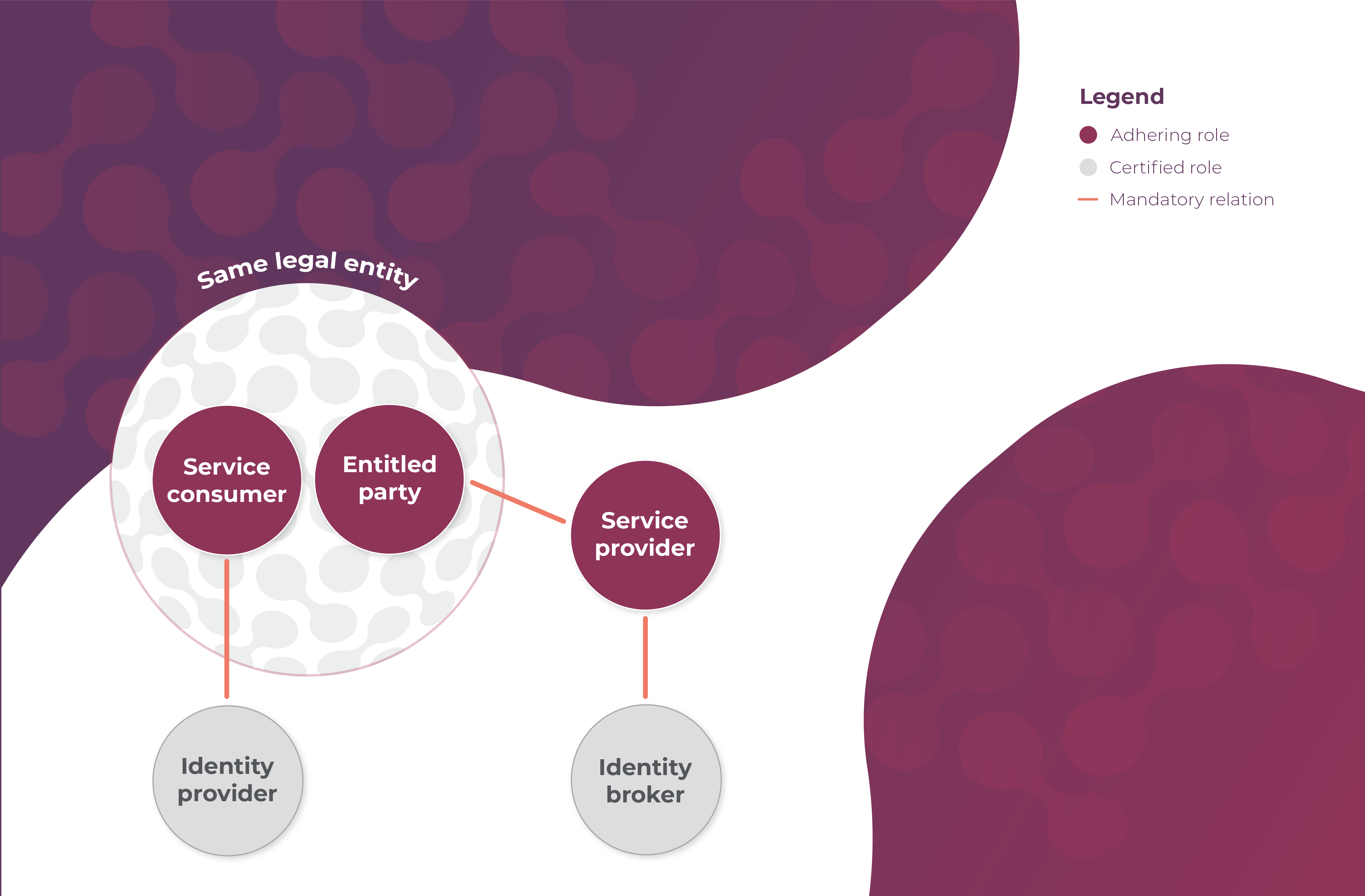 * A mandatory relation between the Service Provider and the Identity Broker covers the use of Identity Broker Z's services, including a connection to several Identity Providers, by the Service Provider (Party B);